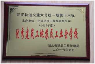 近日,從湖北省建筑工程管理局傳來喜訊,上海工程局市政公司武漢地鐵6號線16標(biāo)項(xiàng)目部農(nóng)民工業(yè)校榮獲2015年度湖北省“優(yōu)秀建筑工地農(nóng)民工業(yè)余學(xué)?!狈Q號。