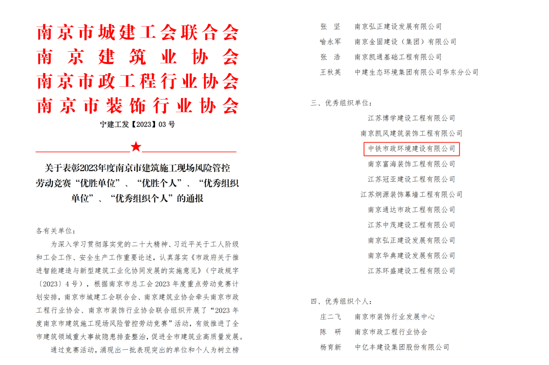 11月13日,2023年度南京市建筑施工現(xiàn)場風險管控勞動競賽表彰名單公示,南京龍袍項目代表公司獲得“優(yōu)秀組織單位”表彰。...