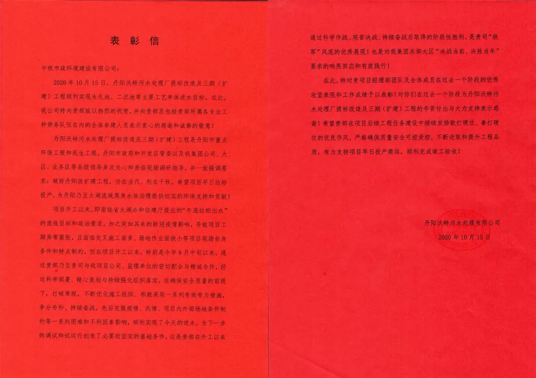 公司收到丹陽沃特污水處理有限公司表彰信...