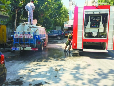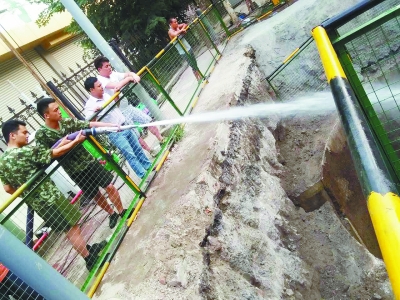 在管道內(nèi)淤泥疏松后,需大量的水對管道內(nèi)進行沖洗,為保證用水,市消防局安排了一輛消防車專門支持管道沖洗。據(jù)悉,消防車一次能提供15立方米的水,可以使用半小時。但工地附近無消防栓,每次加水均要回到消防隊,導致施工難度大、功效低。